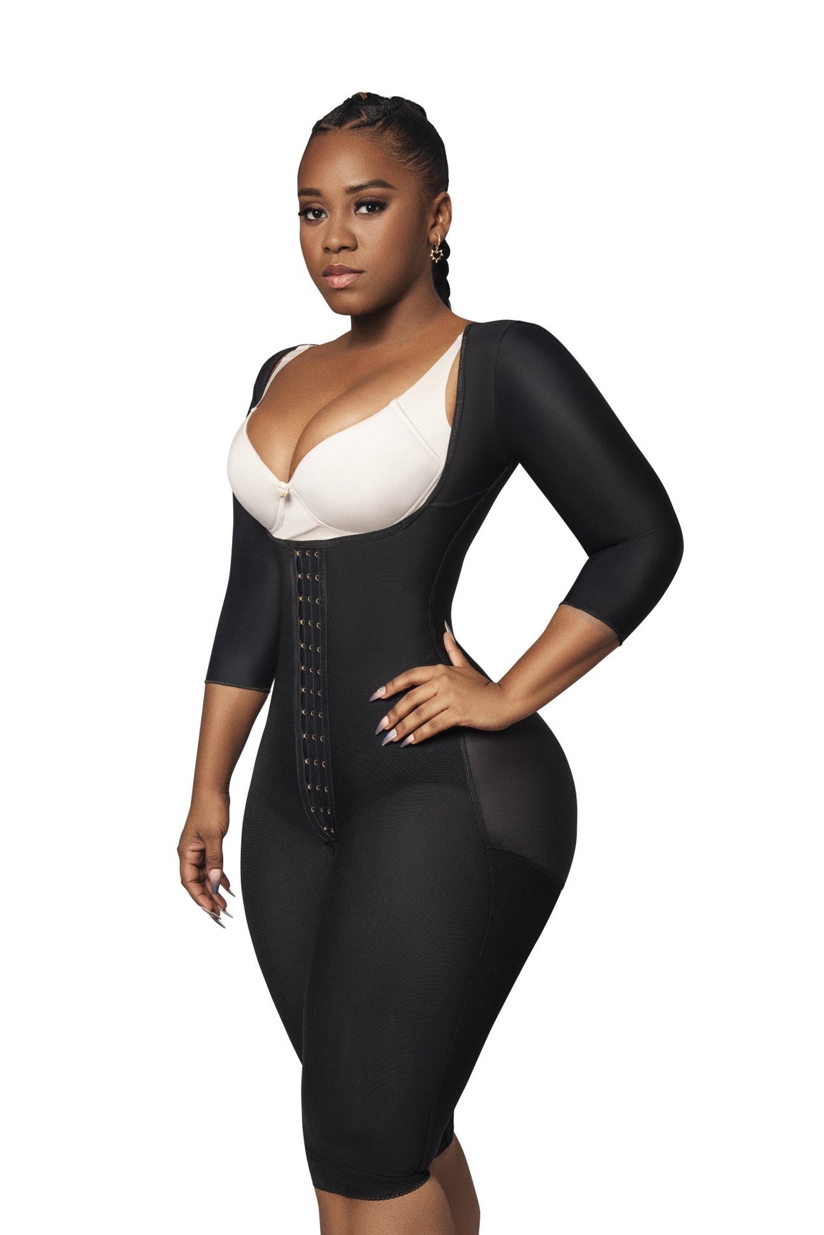 La faja de la línea Luxury BBL 225 cuenta con broches centrales dorados de tres posiciones, ideales para resaltar tu cintura con un efecto reloj de arena y moldear tu figura de forma armónica. Su brasier prehormado proporciona un redondeo natural al busto, mientras que sus mangas tipo sisa te ayudan a moldear la espalda, ofreciendo una compresión equilibrada y elegante.